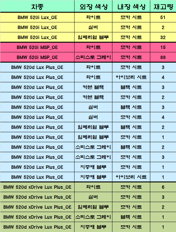 BMW 5시리즈 520i, 520d 8월 재고현황을